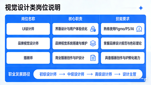 路径:初级设计师 → 中级设计师 → 高级设计师 → 设计专家/设计总监