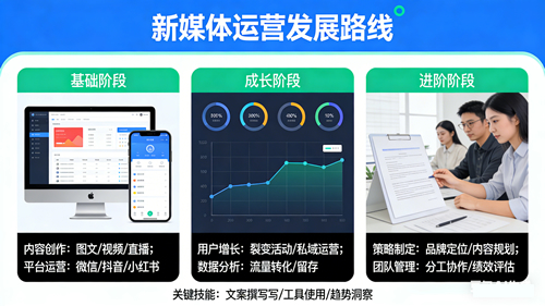 3.入职后:持续学习新技术(如 AIGC 新工具、新平台运营规则),积累项目经验;同时注重职业素养的提升(沟通、协作、抗压),为晋升或跳槽做好软硬实力的双重准备。